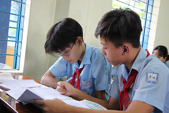 Nguyễn Hoàng Thiên Lộc (phải) đang hướng dẫn bạn trong tiết học môn ngữ văn